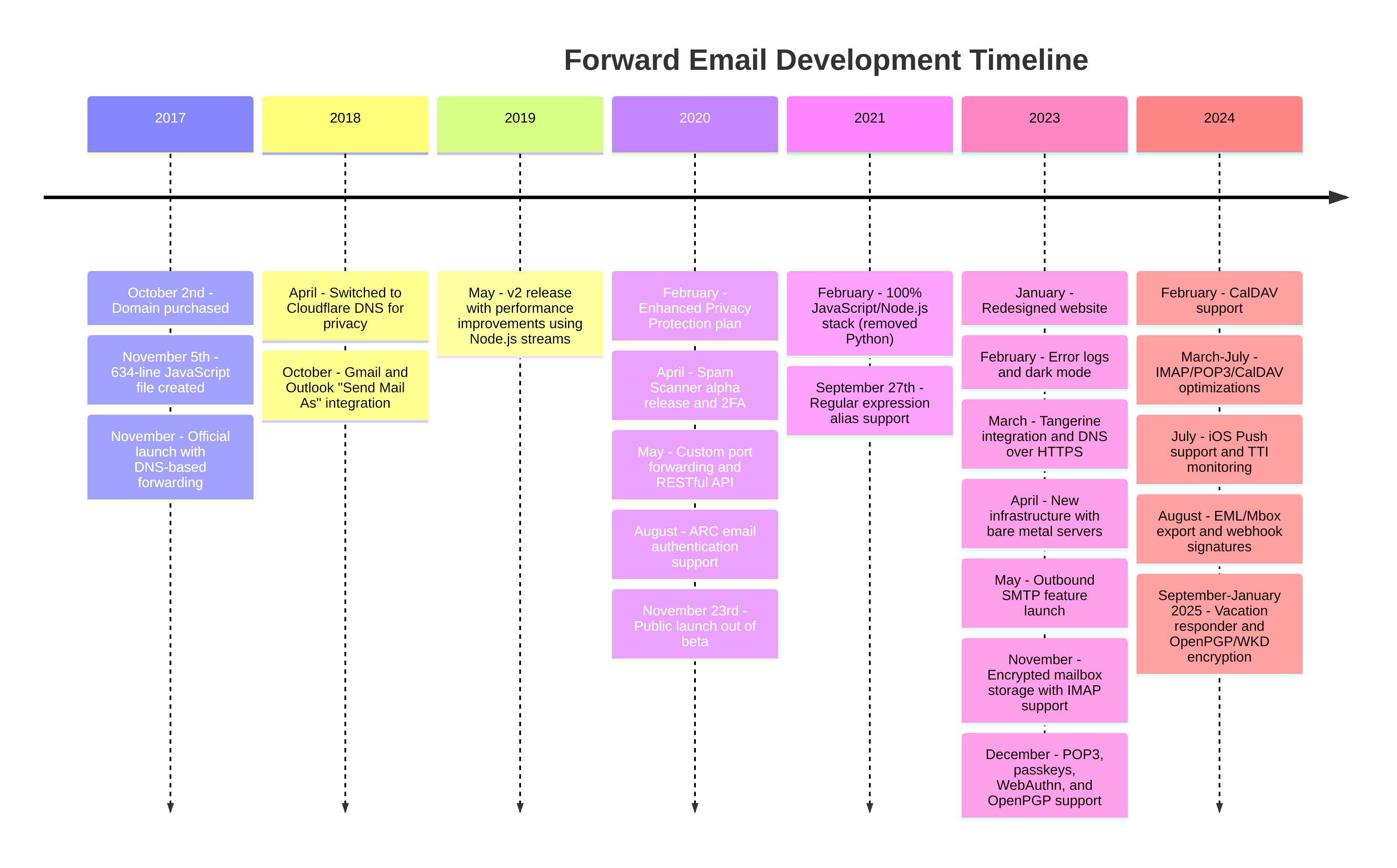نظرة تقنية متعمقة: للاطلاع على تفاصيل شاملة حول نهجنا وبنيتنا وتطبيقنا الأمني، يُرجى الاطلاع على ورقة بيضاء فنية حول إعادة توجيه البريد الإلكتروني وحول الصفحة اللذين يوثقان الجدول الزمني الكامل لتطويرنا منذ عام ٢٠١٧.