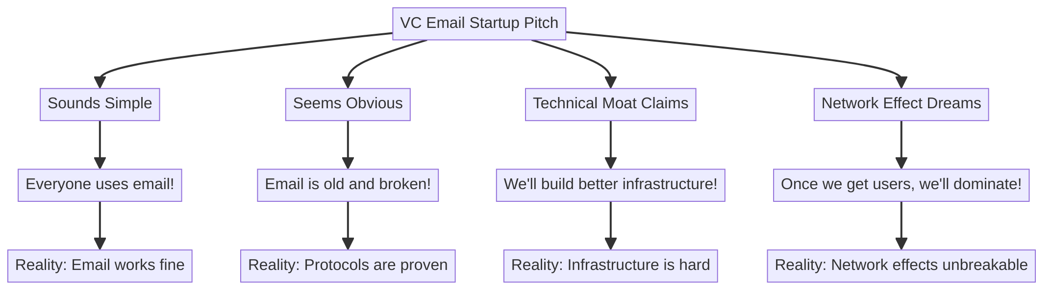 مفارقة تمويل رأس المال المُغامر: يُحبّذ أصحاب رأس المال المُغامر شركات البريد الإلكتروني الناشئة لأنها تبدو بسيطة، لكنها في الواقع مُستحيلة. الافتراضات الأساسية التي تجذب الاستثمار هي بالضبط ما يضمن الفشل.