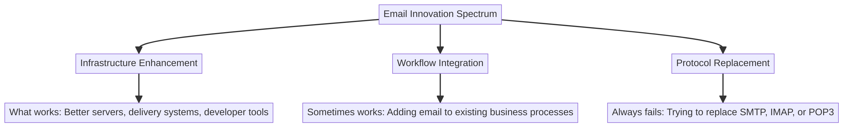 النمط الأساسي: عادةً ما تفشل شركات البريد الإلكتروني الناشئة العميل لمحاولتها استبدال بروتوكولات العمل، بينما يمكن لشركات البنية التحتية للبريد الإلكتروني النجاح من خلال تحسين سير العمل الحالي. يكمن السر في فهم احتياجات المستخدمين الفعلية مقارنةً بما يعتقد رواد الأعمال أنهم بحاجة إليه.