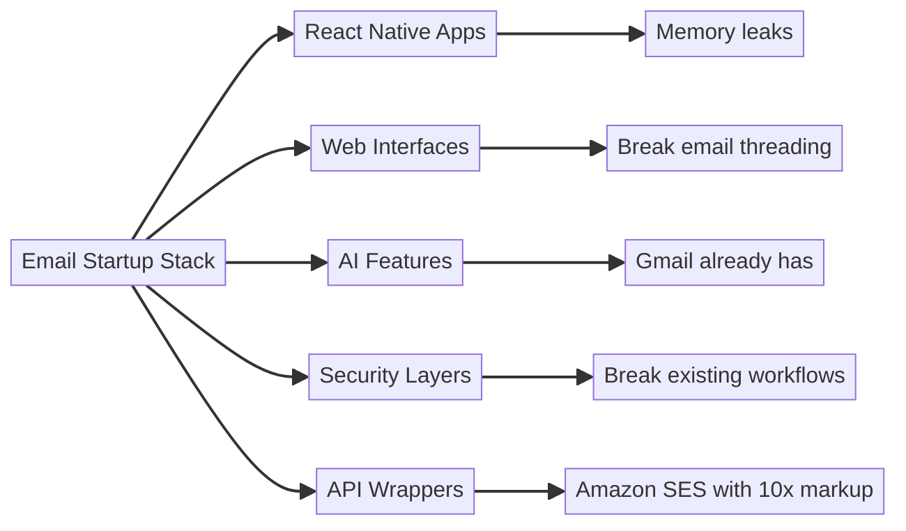 ١. الذكاء الاصطناعي لا يحل مشاكل البريد الإلكتروني غير المهمة: البريد الإلكتروني يعمل بشكل جيد. ٢. Gmail لديه بالفعل الذكاء الاصطناعي: ردود ذكية، صندوق بريد ذي أولوية، تصفية البريد العشوائي. ٣. مخاوف الخصوصية: يتطلب الذكاء الاصطناعي قراءة جميع رسائل بريدك الإلكتروني. ٤. هيكل التكلفة: معالجة الذكاء الاصطناعي مكلفة، والبريد الإلكتروني سلعة. ٥. تأثيرات الشبكة: لا يمكن كسر هيمنة Gmail/Outlook.