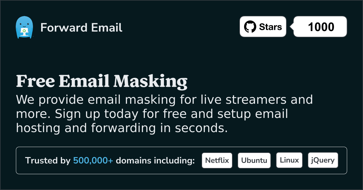We provide email masking for live streamers and more. Sign up today for free and setup email hosting and forwarding in seconds.