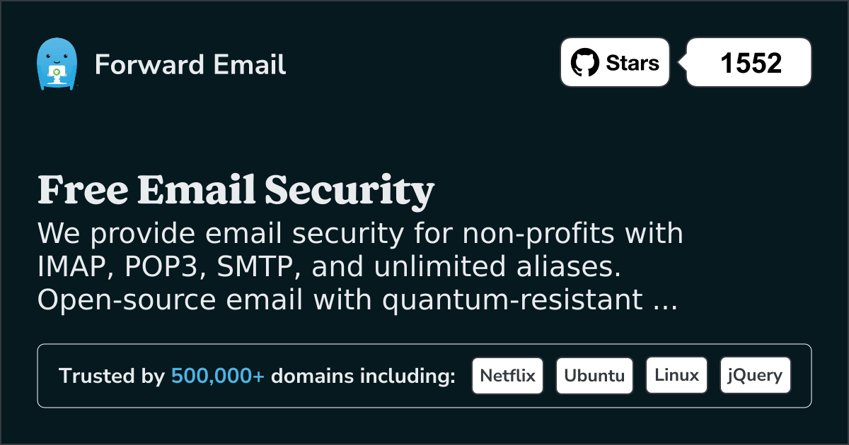 We provide email security for non-profits with IMAP, POP3, SMTP, and unlimited aliases. Open-source email with quantum-resistant encryption. Setup in minutes.