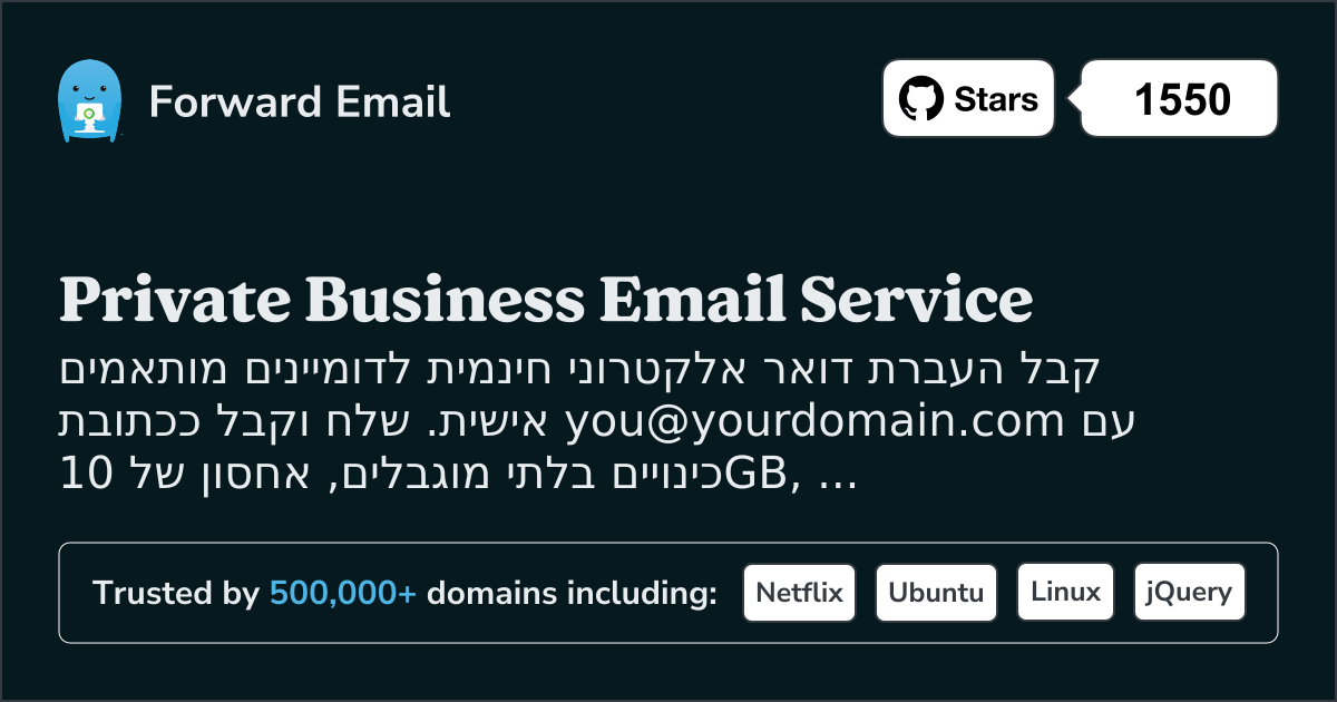 CNAME | autoconfig | autoconfig.forwardemail.net | גילוי אוטומטי של לקוח דואר (Thunderbird, GNOME, KDE) |