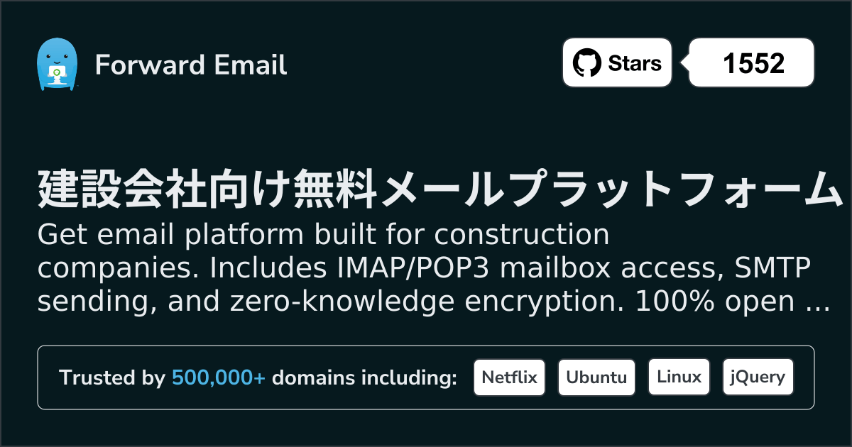 Get email platform built for construction companies. Includes IMAP/POP3 mailbox access, SMTP sending, and zero-knowledge encryption. 100% open source.
