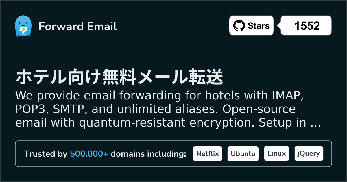 We provide email forwarding for hotels with IMAP, POP3, SMTP, and unlimited aliases. Open-source email with quantum-resistant encryption. Setup in minutes.