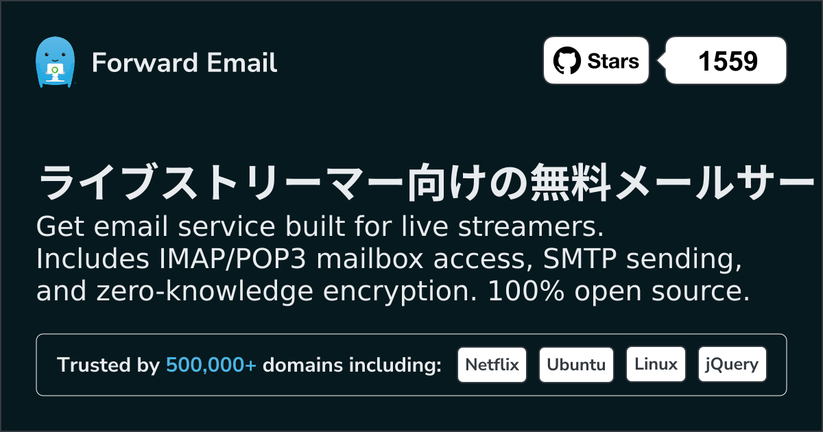 Get email service built for live streamers. Includes IMAP/POP3 mailbox access, SMTP sending, and zero-knowledge encryption. 100% open source.