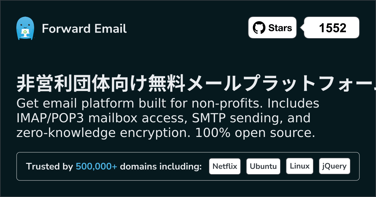 Get email platform built for non-profits. Includes IMAP/POP3 mailbox access, SMTP sending, and zero-knowledge encryption. 100% open source.
