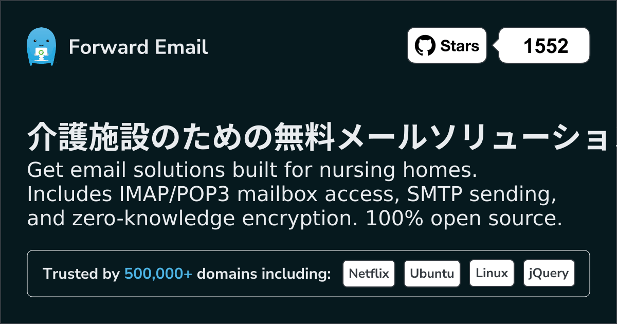 Get email solutions built for nursing homes. Includes IMAP/POP3 mailbox access, SMTP sending, and zero-knowledge encryption. 100% open source.