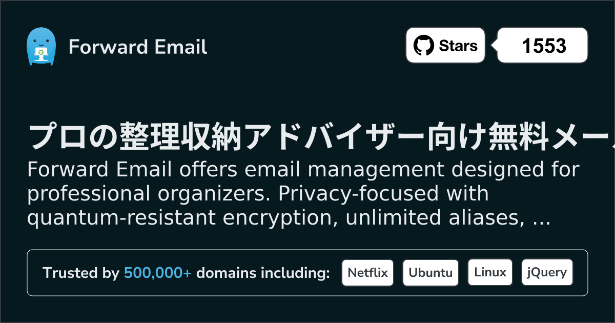 Forward Email offers email management designed for professional organizers. Privacy-focused with quantum-resistant encryption, unlimited aliases, and full email hosting from $3/mo.