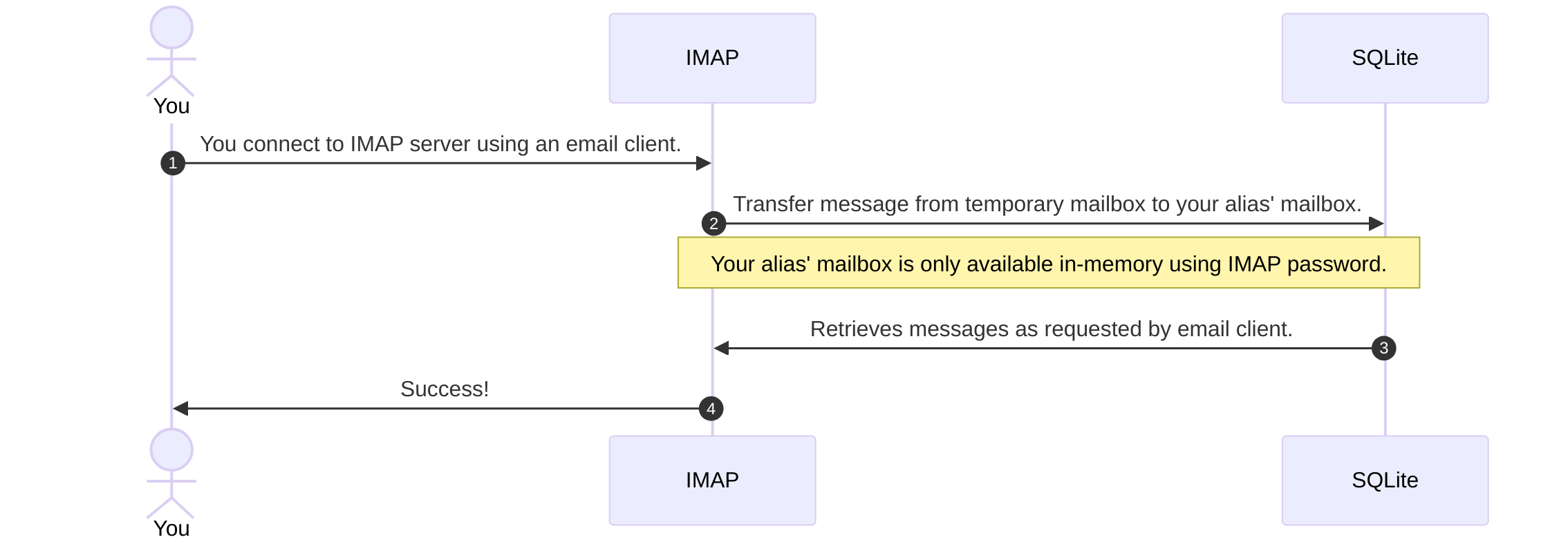 이메일 클라이언트를 사용하여 IMAP 서버에 연결하면 비밀번호가 메모리에 암호화되어 사서함을 읽고 쓰는 데 사용됩니다. 사서함은 이 비밀번호로만 읽고 쓸 수 있습니다. 이 비밀번호를 가진 사람은 본인뿐이므로, 본인만 사서함에 액세스하는 동안 읽고 쓸 수 있습니다. 다음에 이메일 클라이언트가 메일을 폴링하거나 동기화를 시도할 때 새 메시지는 이 임시 사서함에서 전송되어 제공된 비밀번호를 사용하여 실제 사서함 파일에 저장됩니다. 이 임시 사서함은 이후 삭제되어 비밀번호로 보호된 사서함에만 메시지가 저장됩니다.