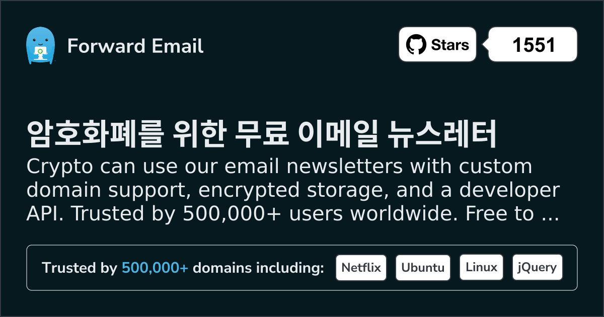 Congrats for fully launching Forward Email – a forwarding service for email that doesn't keep logs or store emails, and which works with ARC to ensure signed forwards don't trip email filters 👏. I'm a happy user! ❤️