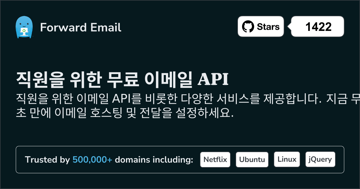 직원을 위한 이메일 API를 비롯한 다양한 서비스를 제공합니다. 지금 무료로 가입하시고 몇 초 만에 이메일 호스팅 및 전달을 설정하세요.