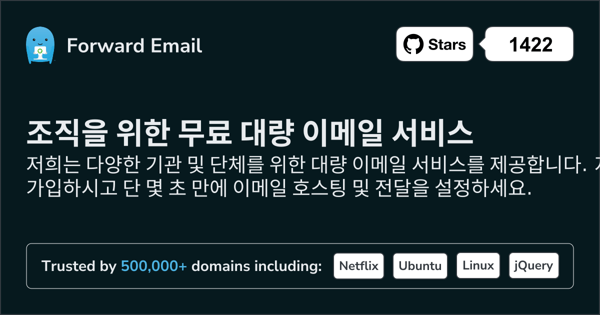 저희는 다양한 기관 및 단체를 위한 대량 이메일 서비스를 제공합니다. 지금 무료로 가입하시고 단 몇 초 만에 이메일 호스팅 및 전달을 설정하세요.