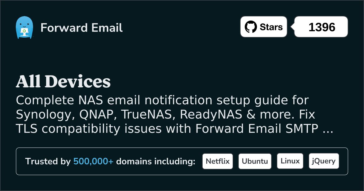 Whether you're managing a single home NAS device or multiple enterprise storage systems, Forward Email provides the infrastructure and compatibility needed for reliable email notifications. Our service's focus on NAS device compatibility, combined with comprehensive documentation and support, ensures that your critical system alerts reach you when you need them most.