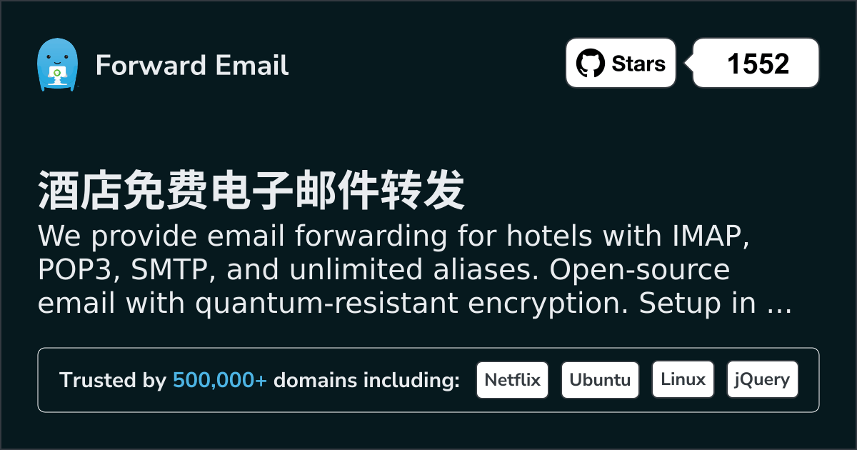 We provide email forwarding for hotels with IMAP, POP3, SMTP, and unlimited aliases. Open-source email with quantum-resistant encryption. Setup in minutes.