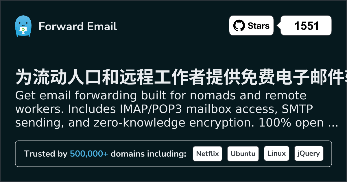 Get email forwarding built for nomads and remote workers. Includes IMAP/POP3 mailbox access, SMTP sending, and zero-knowledge encryption. 100% open source.