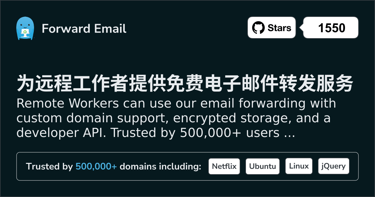 Remote Workers can use our email forwarding with custom domain support, encrypted storage, and a developer API. Trusted by 500,000+ users worldwide. Free to start.