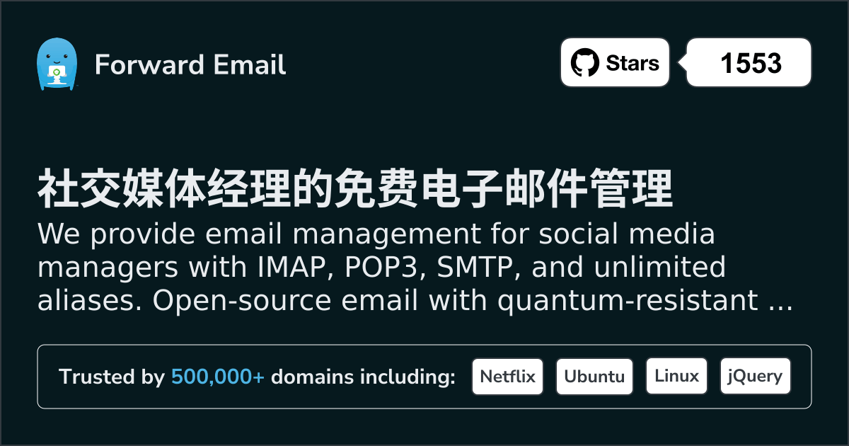 Congrats for fully launching Forward Email – a forwarding service for email that doesn't keep logs or store emails, and which works with ARC to ensure signed forwards don't trip email filters 👏. I'm a happy user! ❤️