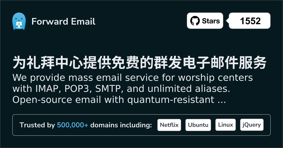We provide mass email service for worship centers with IMAP, POP3, SMTP, and unlimited aliases. Open-source email with quantum-resistant encryption. Setup in minutes.